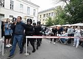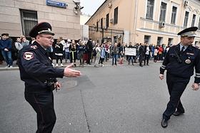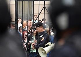 Акция в поддержку независимых кандидатов в депутаты Московской городской думы у здания Московской городской избирательной комиссии (Мосгоризбирком). Сотрудники полиции и участники во время акции.