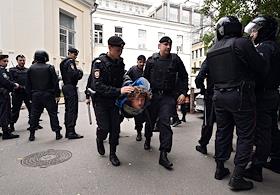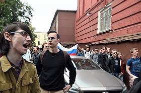 Акция в поддержку независимых кандидатов в депутаты Московской городской думы у здания Московской городской избирательной комиссии (Мосгоризбирком). Сотрудники полиции во время задержания участников акции.