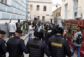 Акция в поддержку независимых кандидатов в депутаты Московской городской думы у здания Московской городской избирательной комиссии (Мосгоризбирком). Участники во время акции. Сотрудники полиции во время акции.
