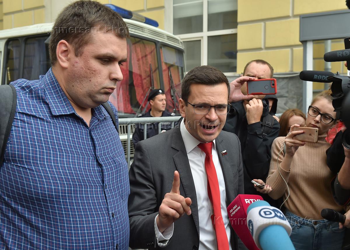 Независимые кандидаты в депутаты в Московскую городскую думу (Мосгордума) слева направо: Дмитрий Гудков, Любовь Соболь и Иван Жданов перед началом встречи председателя Московской городской избирательной комиссии Валентина Горбунова с независимыми кандидатами в Московскую городскую думу.