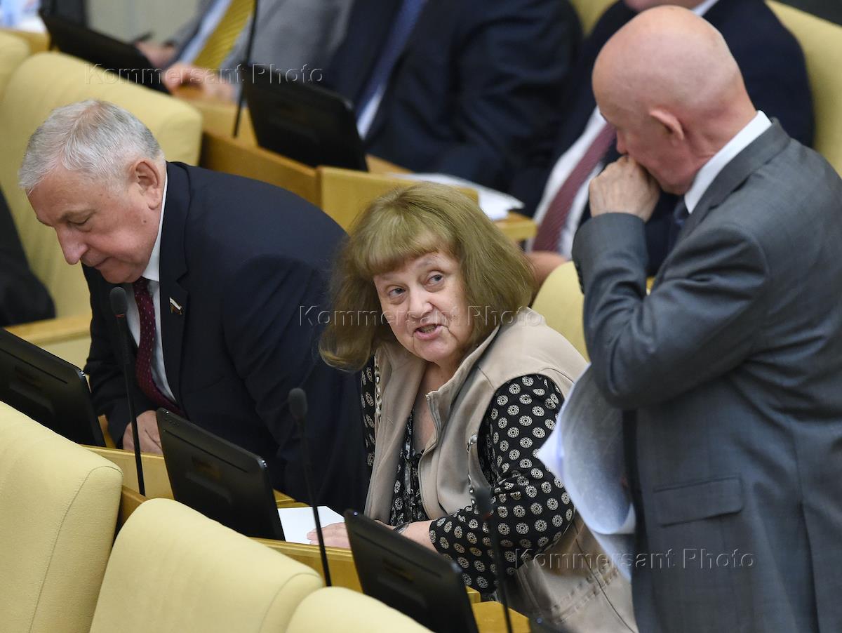 Пленарное заседание Государственной думы (ГД) России. Слева направо: председатель комитета ГД России по региональной политике и проблемам Севера и Дальнего Востока Николай Харитонов, заместитель председателя комитета ГД России по обороне Светлана Савицкая и первый заместитель председателя комитета ГД России по государственному строительству и законодательству Юрий Синельщиков перед началом заседания.