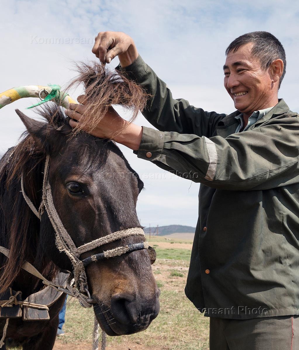 СПК "Победа". Животновод Хубита Доржиев делает прическу лошади.