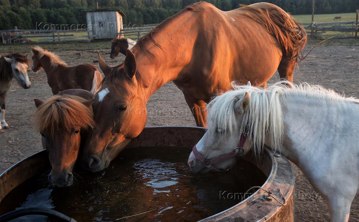 Жанровая фотография. Возрождение коневодства энтузиастами-конезаводчиками России. Кони донской породы, шетлендские пони на водопое.