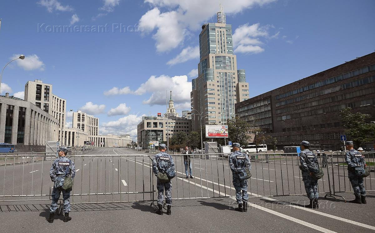 Митинг за допуск на выборы независимых кандидатов в депутаты в Московскую городскую думу (Мосгордума) на проспекте Академика Сахарова. Сотрудники Росгвардии во время митинга.