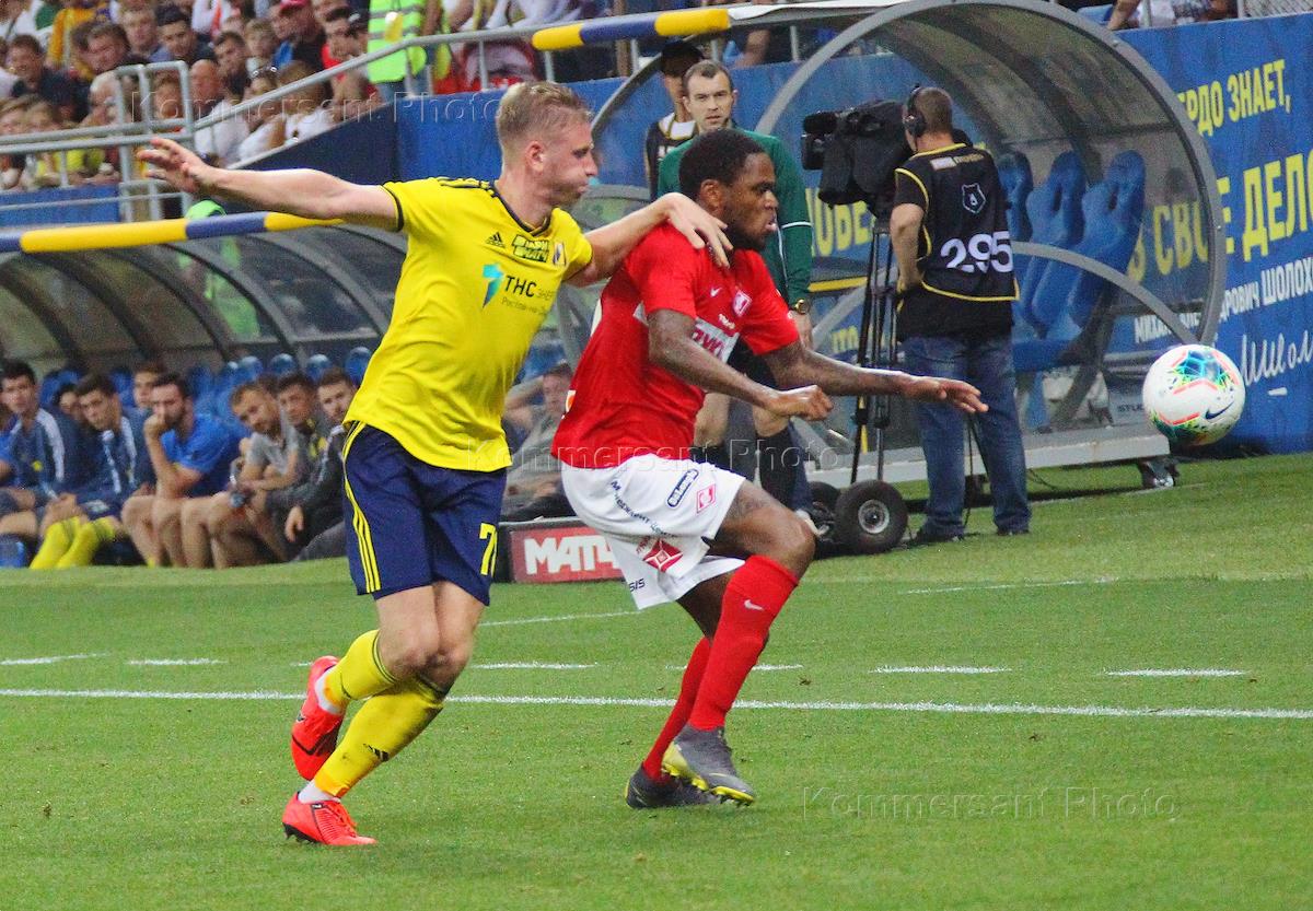 Российская Премьер-лига (РПЛ). Чемпионат России по футболу 2019/2020. 2-й тур. Матч между командами "Спартак" (Москва) и "Ростов" (Ростов-на-Дону) на стадионе "Ростов-Арена". Игрок команды "Ростов" Ивелин Попов (слева) во время матча.