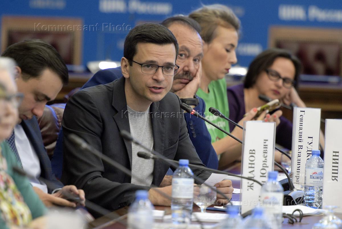 Встреча председателя Центральной избирательной комиссии (ЦИК) России Эллы Памфиловой с незарегистрированными кандидатами в депутаты Московской городской думы. Глава совета депутатов Красносельского района Илья Яшин (слева) во время встречи.