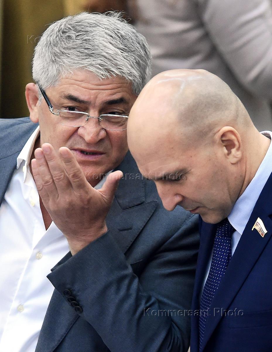Пленарное заседание Государственной думы (ГД) России. Член комитета ГД России по транспорту и строительству Абдулгамид Эмиргамзаев (слева) и член комитета ГД России по образованию и науке Николай Земцов (справа) во время заседания.