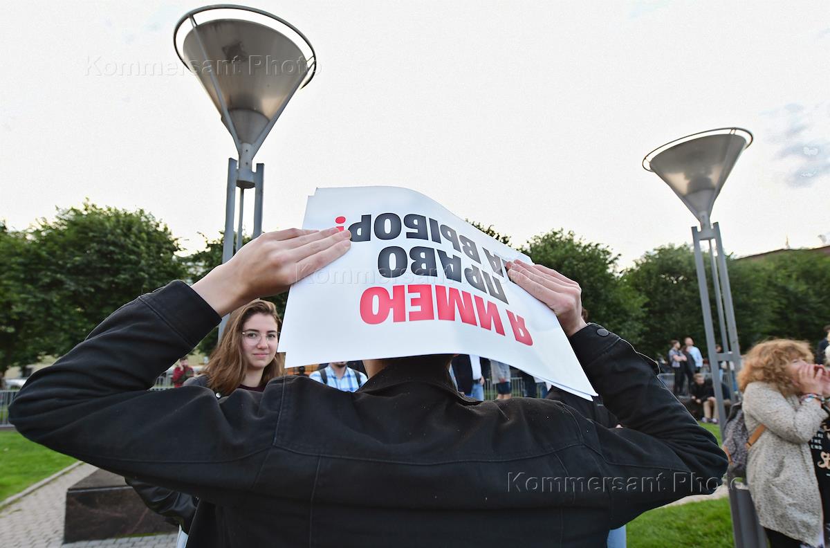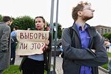 Митинг против произвола на выборах в Санкт-Петербурге на площади Ленина. Участница держит плакат "Выборы ли это?".