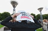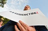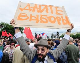 Митинг против произвола на выборах в Санкт-Петербурге на площади Ленина. Участник митинга держит плакат с надписью "дайте выборы".