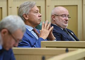 The last plenary session of the spring session of the Federation Council of Russia. Representative in the Federation Council of Russia from the legislative (representative) authority of the Perm Territory Alexei Pushkov (left) and Chairman of the Federation Council Committee for Constitutional Legislation, Legal and Judicial Issues, Development of Civil Society Andrei Klishas (right) at the meeting.