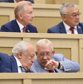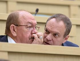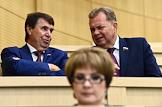 The last plenary session of the spring session of the Federation Council of Russia. Representative in the Federation Council of Russia from the legislative (representative) authority of the Republic of Crimea Sergey Tsekov (left) and representative in the Federation Council of Russia from the executive authority of the Arkhangelsk region Viktor Pavlenko (right) before the meeting.