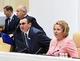 The last plenary session of the spring session of the Federation Council of Russia. Representative in the Federation Council of Russia from the legislative (representative) authority of the Republic of Kalmykia Alexei Mayorov (center) during the meeting.
