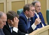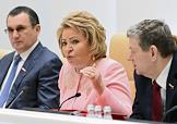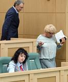 The last plenary session of the spring session of the Federation Council of Russia. Right to left: Deputy Chairman of the Federation Council of Russia Yevgeny Bushmin, Chairman of the Russian Federation Council Valentina Matvienko and First Deputy Chairman of the Russian Federation Council Nikolai Fyodorov during the meeting.