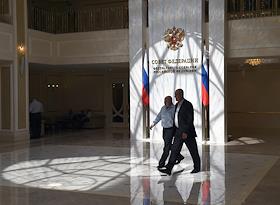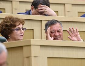 The last plenary session of the spring session of the Federation Council of Russia. Representative in the Federation Council of Russia from the legislative (representative) authority of the Republic of Dagestan Suleiman Kerimov (left) and representative in the Federation Council of Russia from the executive authority of the Republic of Tyva Republic Lyudmila Narusova (right) during the meeting.