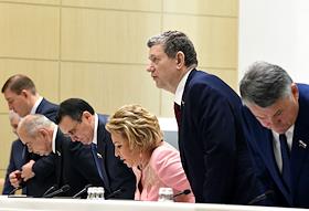 The last plenary session of the spring session of the Federation Council of Russia. Right to left: Chairman of the Federation Council of Russia Valentina Matvienko, First Deputy Chairman of the Federation Council of Russia Nikolai Fedorov and Deputy Chairman of the Russian Federation Council Ilyas Umakhanov during the meeting.