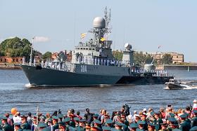 Генеральная репетиция военно-морского парада в честь Дня Военно-Морского Флота в акватории Кронштадтского рейда. Малый противолодочный корабль "Уренгой" во время генеральной репетиции.