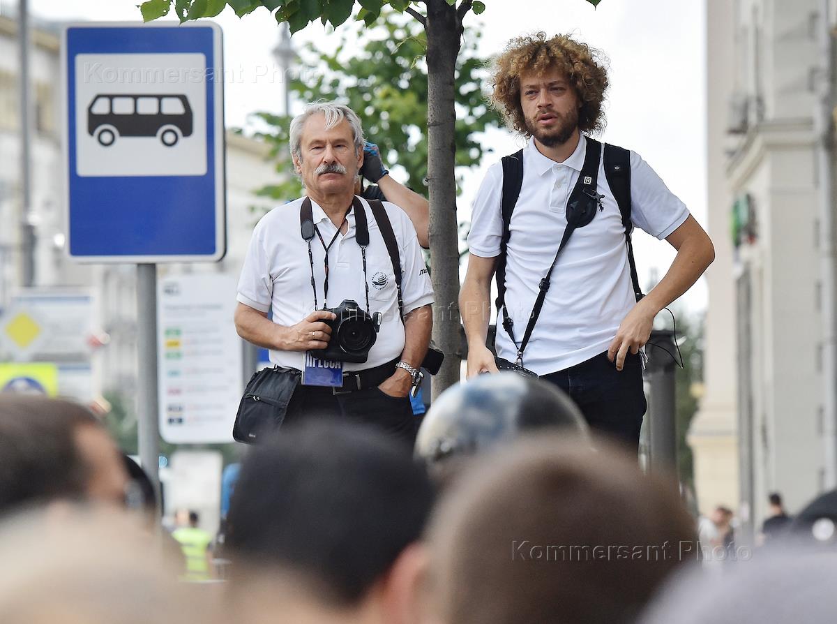Несанкционированная акция в поддержку независимых кандидатов на выборы в Московскую городскую думу в центре Москвы. Фотограф Александр Земляниченко (слева) и блогер Илья Варламов (справа) во время акции.