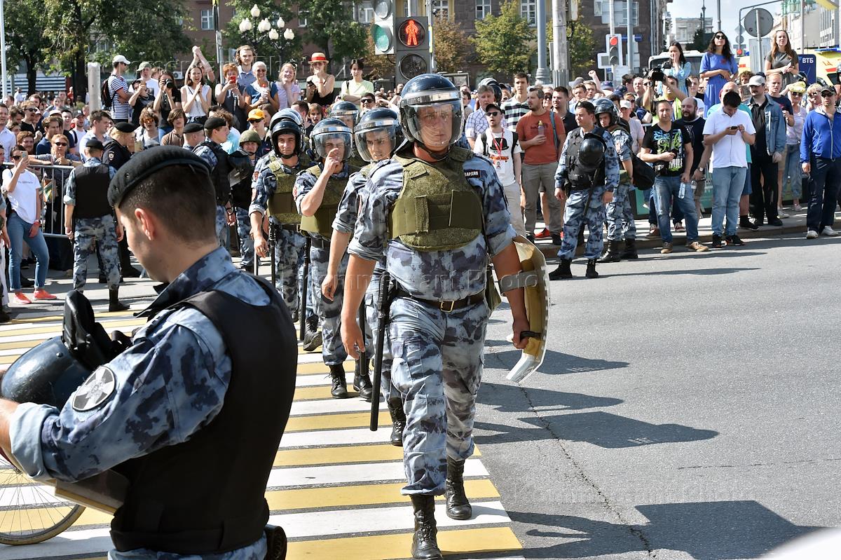 Несанкционированная акция в поддержку независимых кандидатов на выборы в Московскую городскую думу в центре Москвы. Сотрудники полиции в оцеплении во время акции.