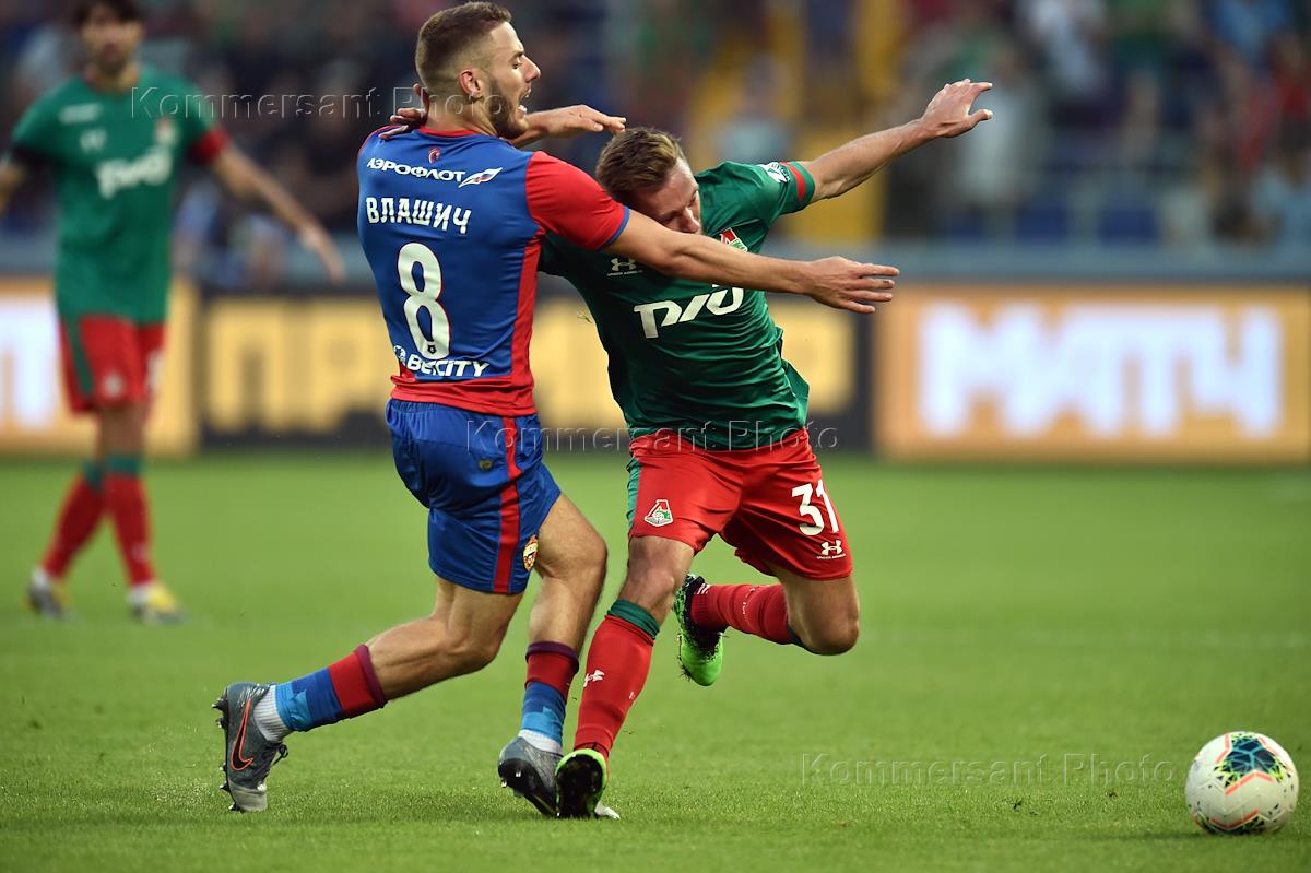 Российская Премьер-лига (РПЛ). Чемпионат России по футболу 2019/2020. 3-й тур. Матч между командами ЦСКА (Москва) и "Локомотив" (Москва) на стадионе "ВЭБ Арена". Игрок команды ЦСКА Никола Влашич (слева) и игрок команды "Локомотив" Мацей Рыбус (справа) во время матча.