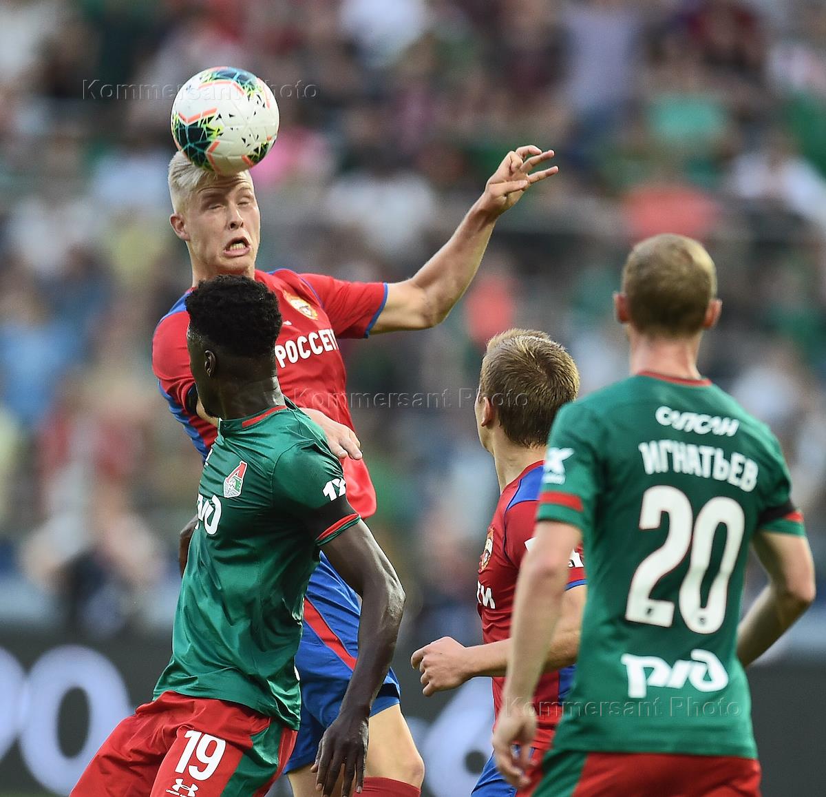 Российская Премьер-лига (РПЛ). Чемпионат России по футболу 2019/2020. 3-й тур. Матч между командами ЦСКА (Москва) и "Локомотив" (Москва) на стадионе "ВЭБ Арена". Игрок команды ЦСКА Хёрдур Магнуссон (слева) во время матча.
