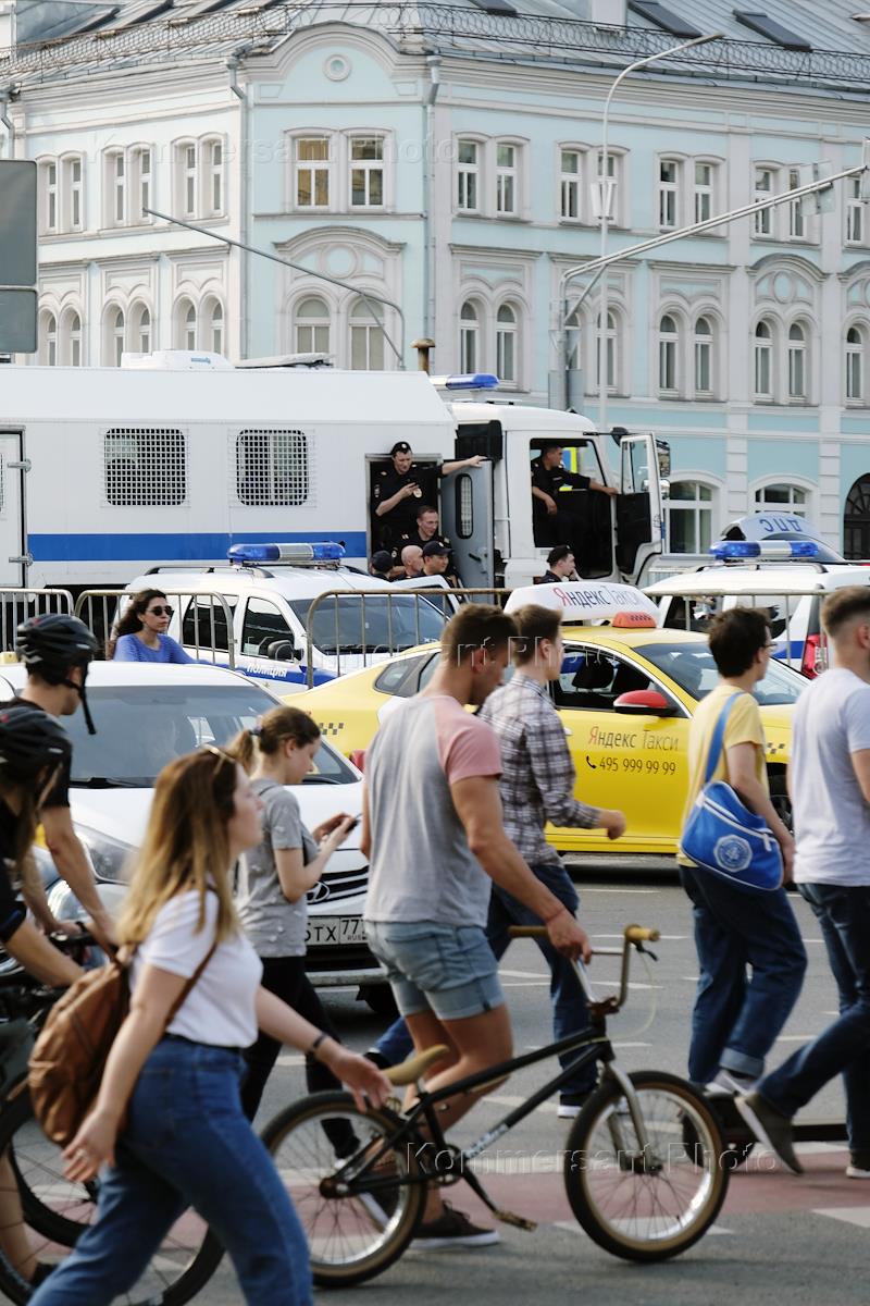 Участники акции в поддержку независимых кандидатов на выборы в Московскую городскую думу в центре города. Сотрудники полиции на акции.