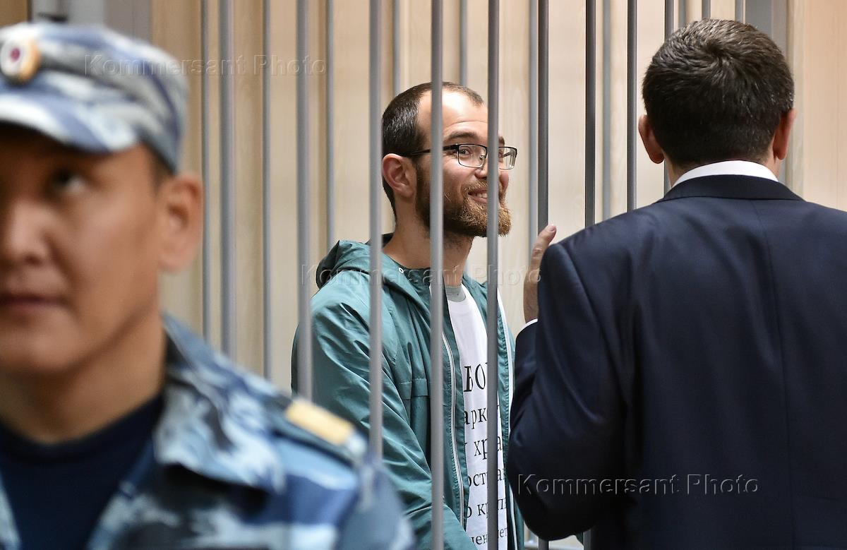 Рассмотрение вопроса о мере пресечения обвиняемым по уголовному делу о массовых беспорядках в Москве 27 июля в Пресненском районном суде. Обвиняемый Кирилл Жуков (в центре) после заседания суда.