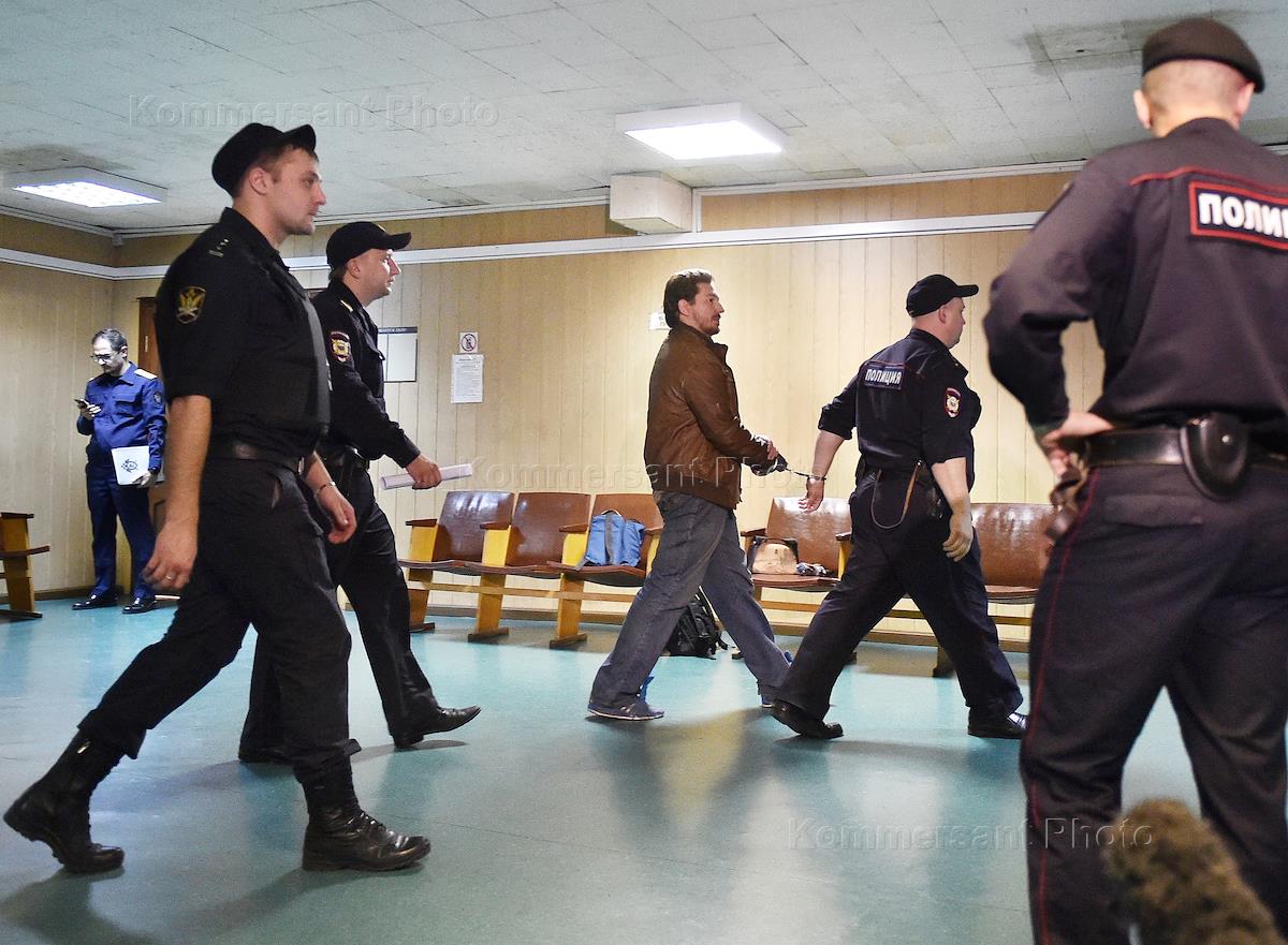 Рассмотрение вопроса о мере пресечения обвиняемым по уголовному делу о массовых беспорядках в Москве 27 июля в Пресненском районном суде. Обвиняемый Кирилл Жуков (в центре) после заседания суда.
