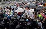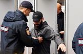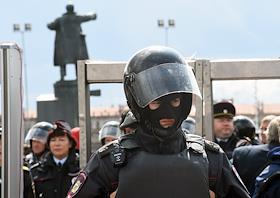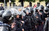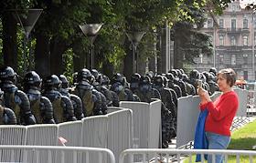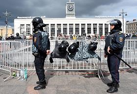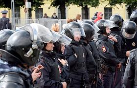 Unauthorized rally in support of independent candidates for elections to the Moscow City Duma in St Petersbourg. Police officers during the rally.