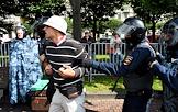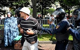 Unauthorized rally in support of independent candidates for elections to the Moscow City Duma in St Petersbourg. Police officers detain participants in the rally.