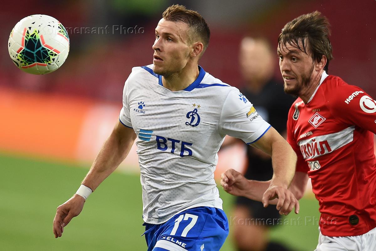 Российская Премьер-лига (РПЛ). Чемпионат России по футболу 2019/2020. 4-й тур. Матч между командами "Спартак" (Москва) и "Динамо" (Москва) на стадионе "Открытие Арена". Игрок команды "Спартак" Роман Зобнин (в центре) и игрок команды "Динамо" Вячеслав Грулёв (справа) во время матча.