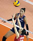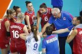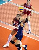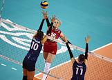 Олимпийский квалификационный турнир по волейболу. Матч между женскими сборными командами России и Республики Корея. Игрок сборной России Ирина Воронкова (в центре) во время матча.