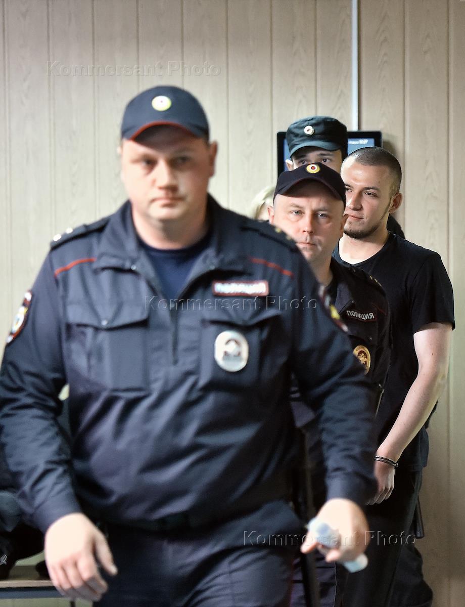 Обвиняемый по делу об участии в массовых беспорядках в Москве 27 июля 2019 года Владислав Барабанов (в центре) перед началом заседания Пресненского районного суда.