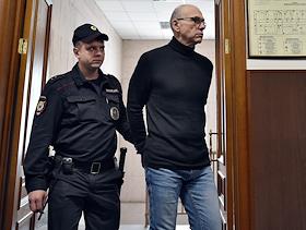 Бывший министр финансов Московской области Алексей Кузнецов (слева), обвиняемый в хищении более 11 млрд рублей, перед началом заседания Басманного районного суда.