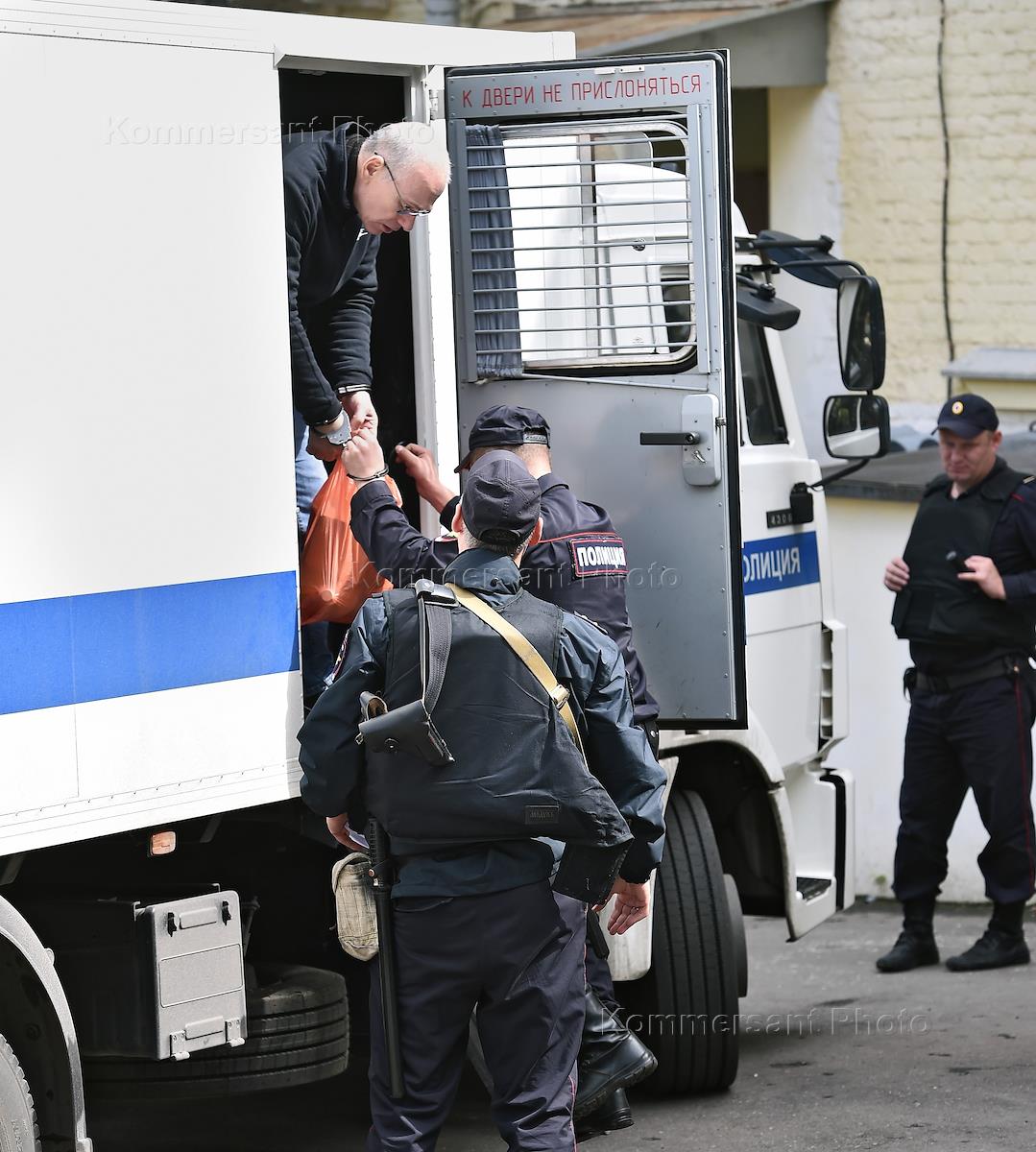 Бывший министр финансов Московской области Алексей Кузнецов (в центре), обвиняемый в хищении более 11 млрд рублей, во время заседания Басманного районного суда.