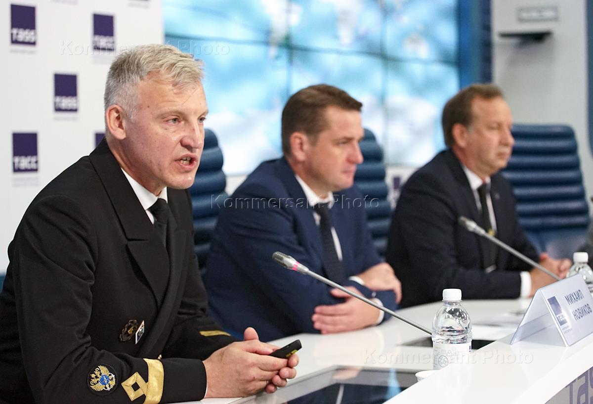 Пресс-конференция на тему: "Кругосветка российских парусников к 200-летию открытия Антарктиды" в агентстве ТАСС. Слева направо: начальник управления мореплавания и практической подготовки Балтийской государственной академии рыбопромыслового флота Михаил Новиков, заместитель министра сельского хозяйства России – руководитель Росрыболовства Илья Шестакови ректор Калининградского государственного технического университета (КГТУ) Владимир Волкогон во время пресс-конференции.