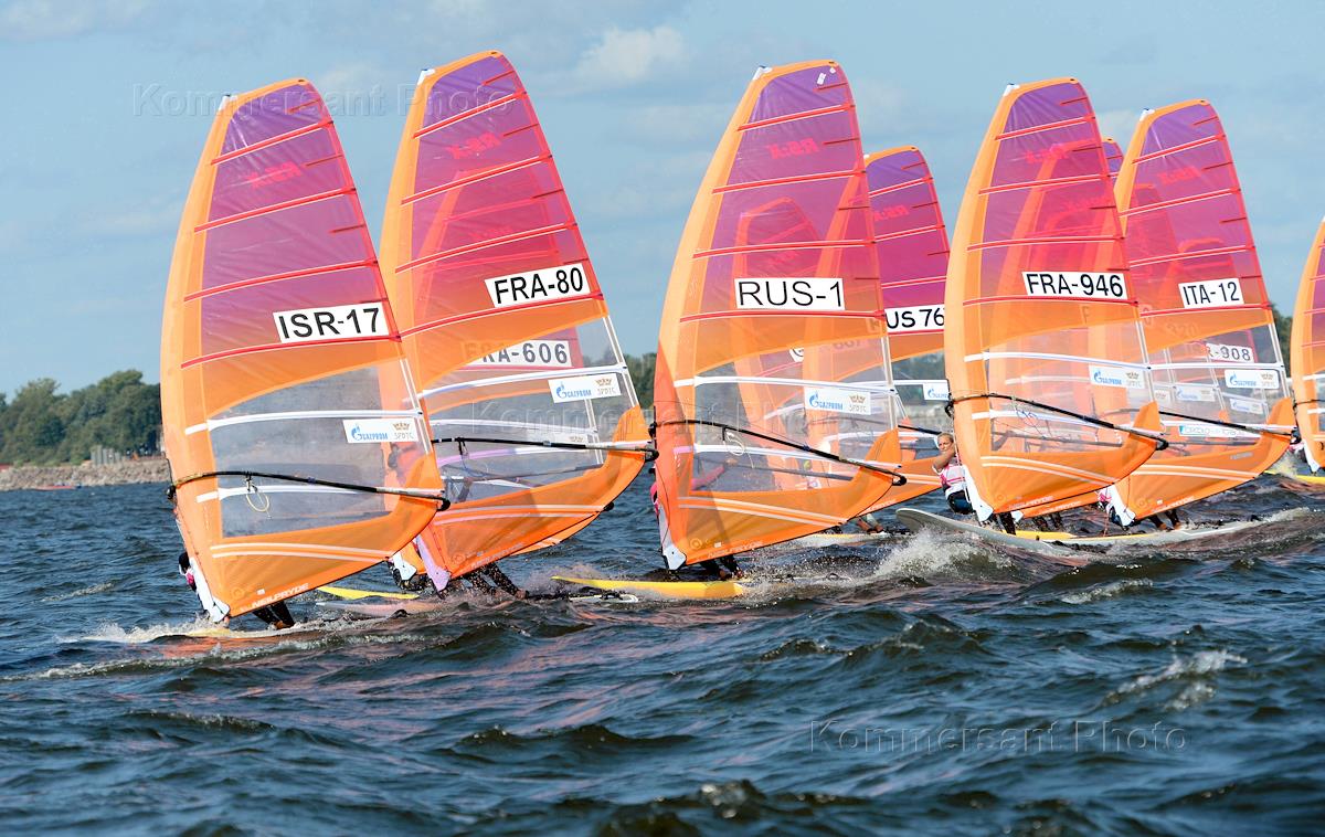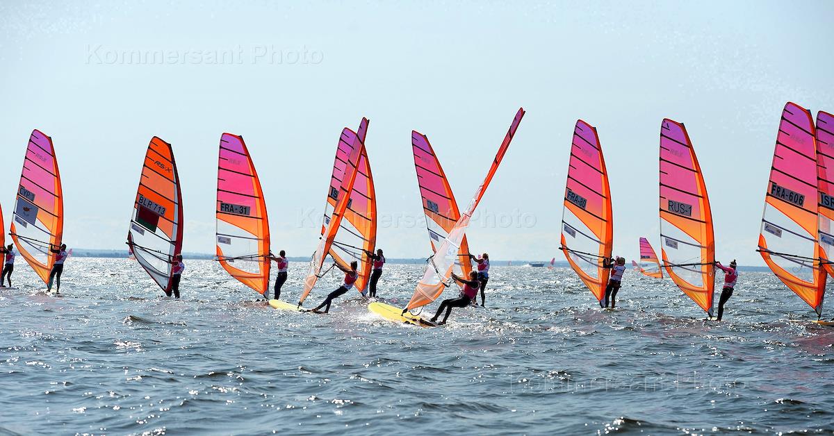 Спортсмены во время выступления на Чемпионате мира по виндсерфингу среди юниоров в гонках класса RS:X, созданного специально для Олимпийских игр.