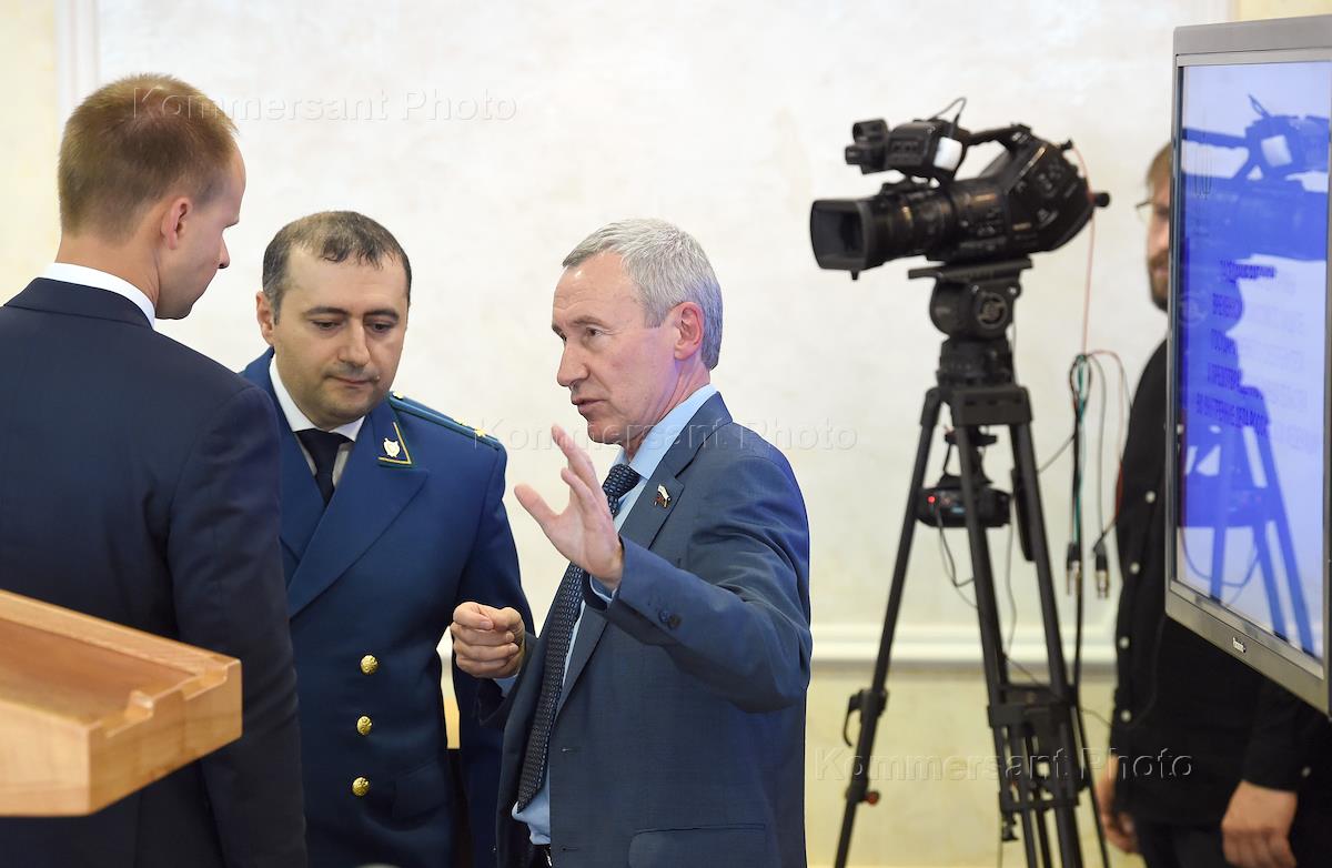 Расширенное заседание рабочей группы Временной комиссии по защите государственного суверенитета и предотвращению вмешательства во внутренние дела России в Совете Федерации (СФ) России. Член Правления комитета МОО "Национальный комитет общественного контроля" Александр Михайлов (слева), начальник правового управления Генеральной прокуратуры России Артур Завалунов (второй справа) и представитель в СФ России от исполнительного органа государственной власти Пермского края Андрей Климов (справа) перед началом заседания.