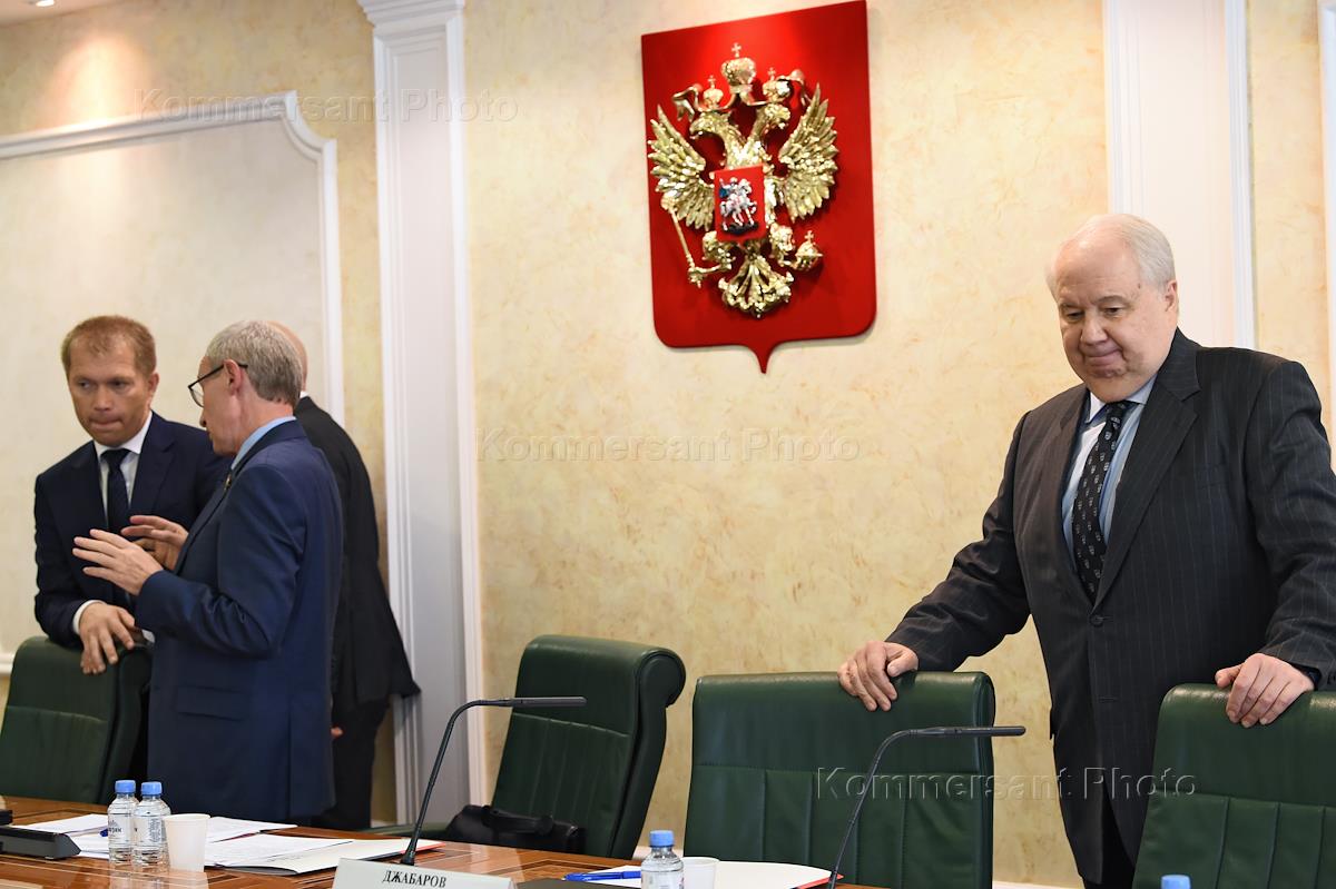 Расширенное заседание рабочей группы Временной комиссии по защите государственного суверенитета и предотвращению вмешательства во внутренние дела России в Совете Федерации (СФ) России. Представитель в СФ России от исполнительного органа государственной власти Пермского края Андрей Климов (слева) и представитель в СФ России от Еврейской автономной республики Владимир Джабаров (второй слева) во время заседания.