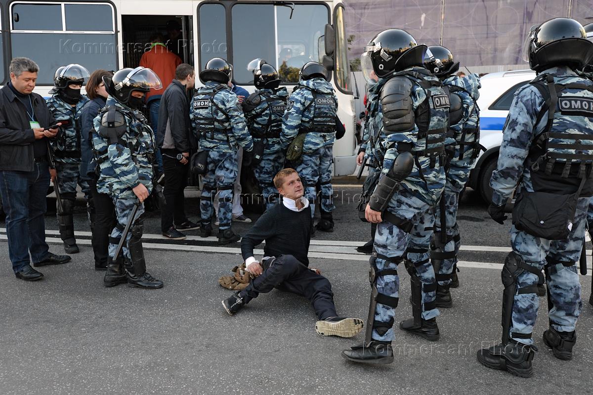 Митинг "За свободные выборы" на площади Ильинские ворота. Сотрудники правоохранительных органов во время задержания участника митинга.