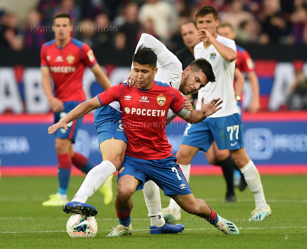 Российская Премьер-лига (РПЛ). Чемпионат России по футболу 2019/2020. 5-й тур. Матч между командами ЦСКА (Москва) и "Сочи" (Сочи) на стадионе "ВЭБ Арена". Игрок команды ЦСКА Марио Фернандес (в центре) и игрок команды "Сочи" Кристиан Нобоа (справа) во время матча.