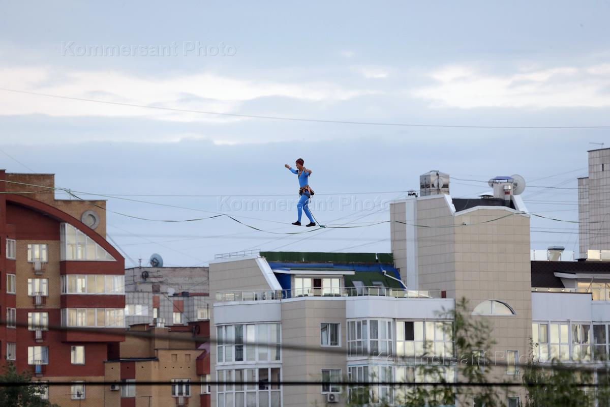 Фестиваль уличных театров Perm Street Fest 2019. Канатоходец Фриди Кюне (Friedi Kuhne, Германия) во время выступления на фестивале.