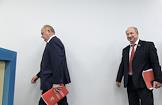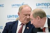 Пресс-конференция кандидатов в депутаты Московской городской думы от КПРФ в информационном агентстве "Интерфакс". Заместитель председателя ЦК КПРФ, первый секретарь Московского городского комитета КПРФ Валерий Рашкин (справа) и лидер КПРФ, член комитета Государственной думы России по делам Содружества Независимых Государств, евразийской интеграции и связям с соотечественниками Геннадий Зюганов (слева) во время пресс-конференции.