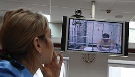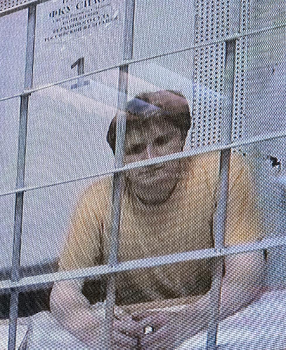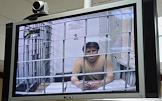 Рассмотрение апелляционной жалобы на арест блогера Владислава Синицы, который проходит по делу об экстремизме из-за поста в его twitter, в Московском городском суде. Владислав Синица (на экране телевизора) во время заседания суда.