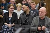 Рассмотрение по существу уголовного дела о хищении денежных средств, выделенных "Седьмой студии" на реализацию театрального проекта "Платформа", в Мещанском районном суде. Слева направо в первом ряду: бывший генеральный директор "Седьмой студии" Юрий Итин, директор Российского Академического Молодежного театра (РАМТ) Софья Апфельбаум, художественный руководитель "Гоголь-центра" Кирилл Серебренников и бывший директор "Гоголь-центра" Алексей Малобродский во время заседания суда.