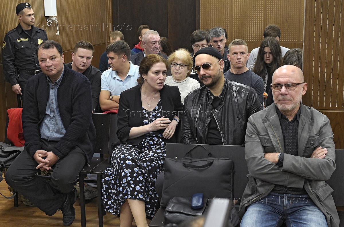Рассмотрение по существу уголовного дела о хищении денежных средств, выделенных "Седьмой студии" на реализацию театрального проекта "Платформа", в Мещанском районном суде. Слева направо в первом ряду: бывший генеральный директор "Седьмой студии" Юрий Итин, директор Российского Академического Молодежного театра (РАМТ) Софья Апфельбаум, художественный руководитель "Гоголь-центра" Кирилл Серебренников и бывший директор "Гоголь-центра" Алексей Малобродский во время заседания суда.