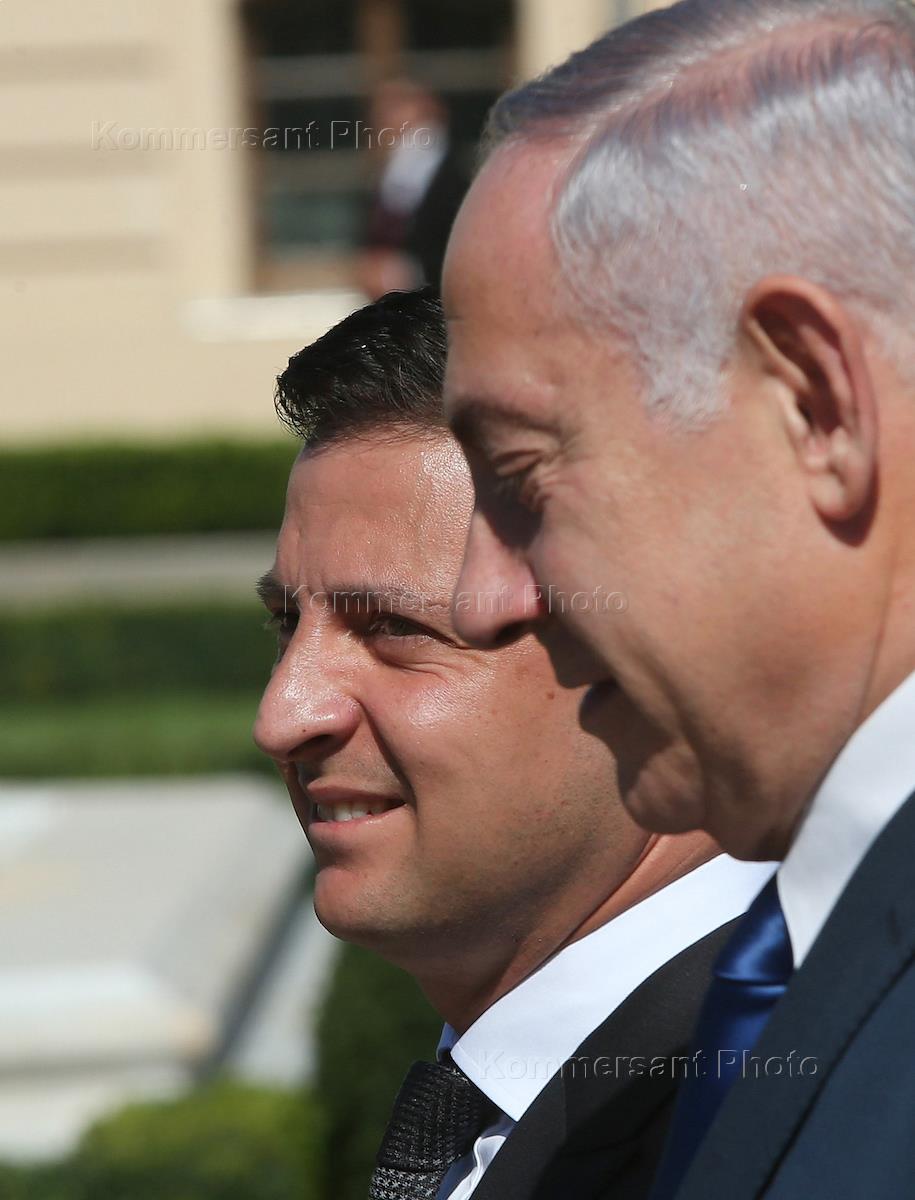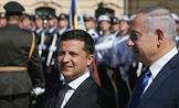 Президент Украины Владимир Зеленский (слева) и премьер-министр Израиля Биньямин Нетаньяху (справа) во время официальной церемонии встречи перед началом переговоров.