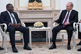 Президент России Владимир Путин (справа) и президент Мозамбика Филипе Ньюси (слева) во время переговоров в Кремле.