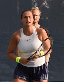 Открытый чемпионат США (US Open) по теннису. Белорусская теннисистка Арина Соболенко (слева) и ее тренер Дмитрий Турсунов (справа) во время чемпионата.