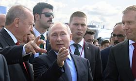 Президент России Владимир Путин (слева) и президент Турции Реджеп Тайип Эрдоган (справа) во время переговоров на полях Международного авиационно-космического салона МАКС-2019 в Жуковском.