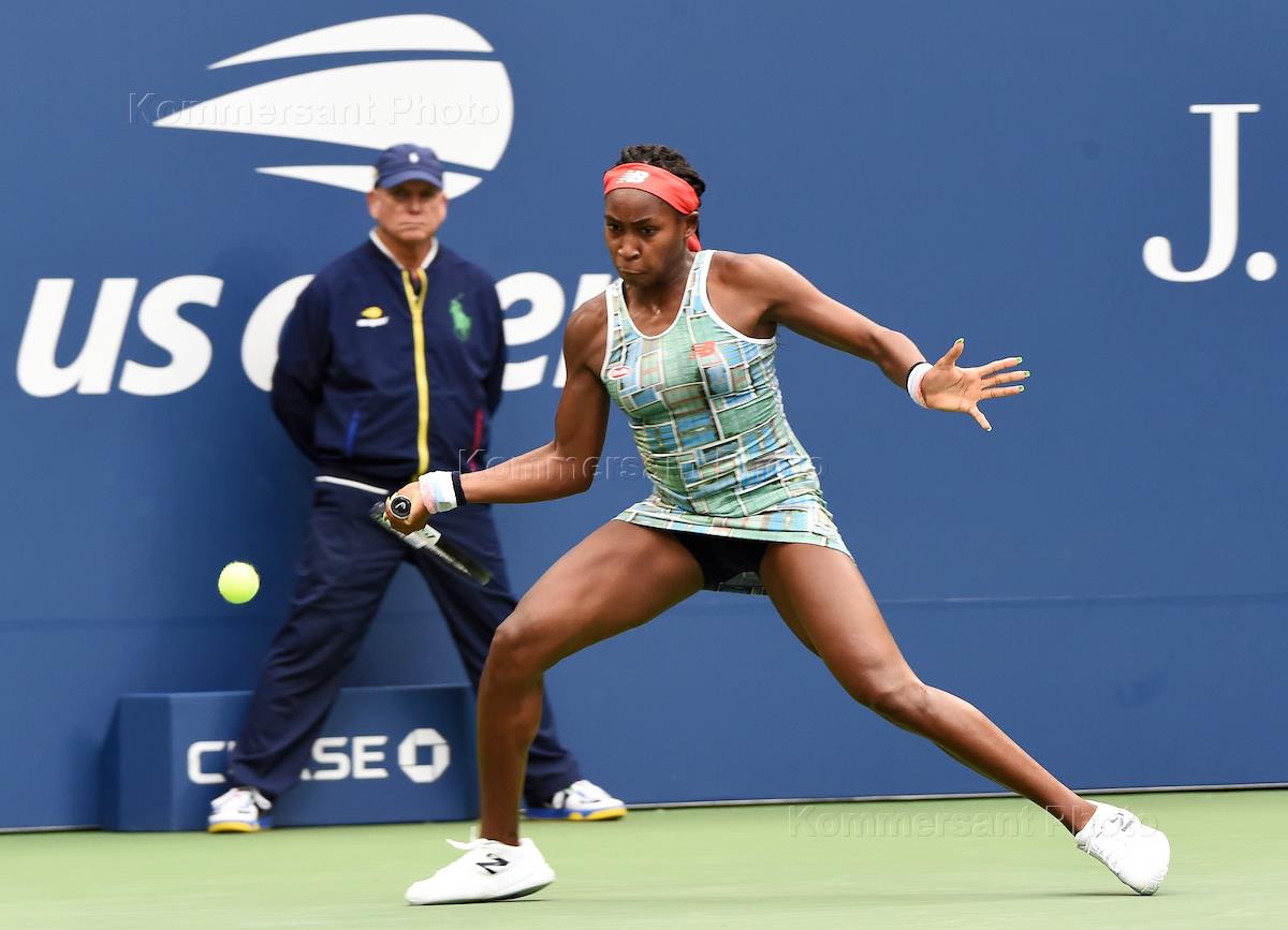 Открытый чемпионат США (US Open) по теннису. Американская теннисистка Кори Гауфф во время матча. с российской теннисисткой Анастасией Потаповой.